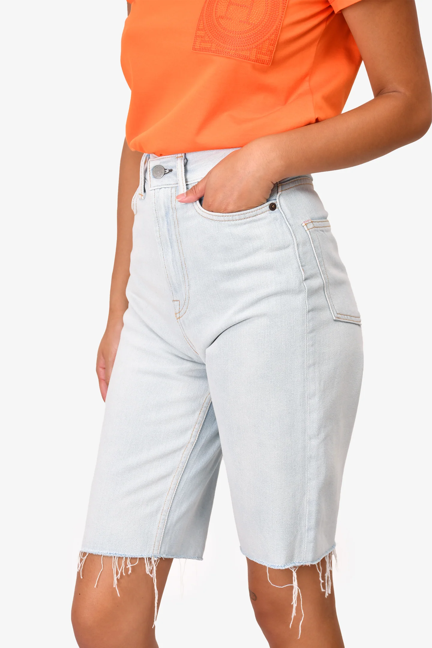 Acne Studios Light Blue Denim Bermuda Shorts. Contrast topstitching. Intentional frayed hemming.