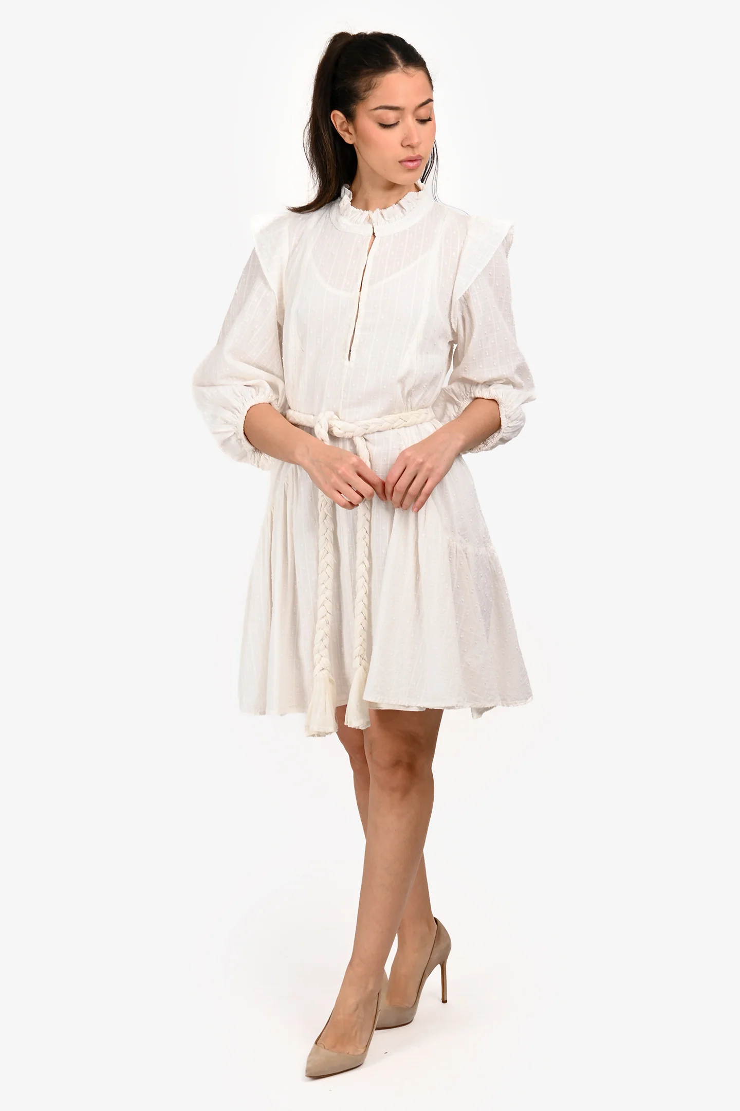 Apiece Apart White Embroidered Midi Dress with Braided Belt. Raised neckline. Front hook-up closures. Elasticized cuffs. Built-in interior slip dress with adjustable straps. Tonal stitching.