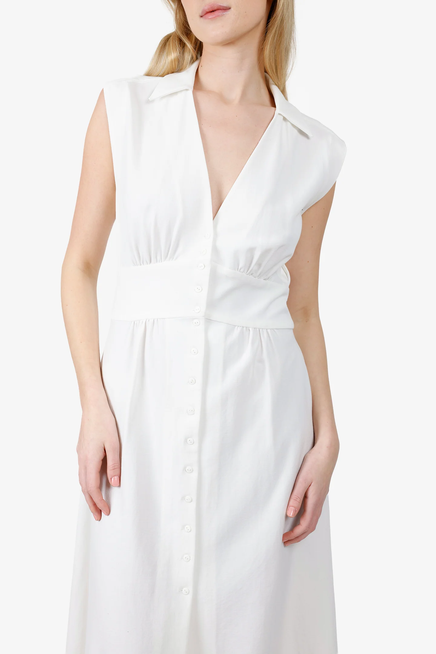 Ba&sh White Button Down Sleeveless Midi Dress. Collared neckline. Front button-up closure. Tonal stitching.