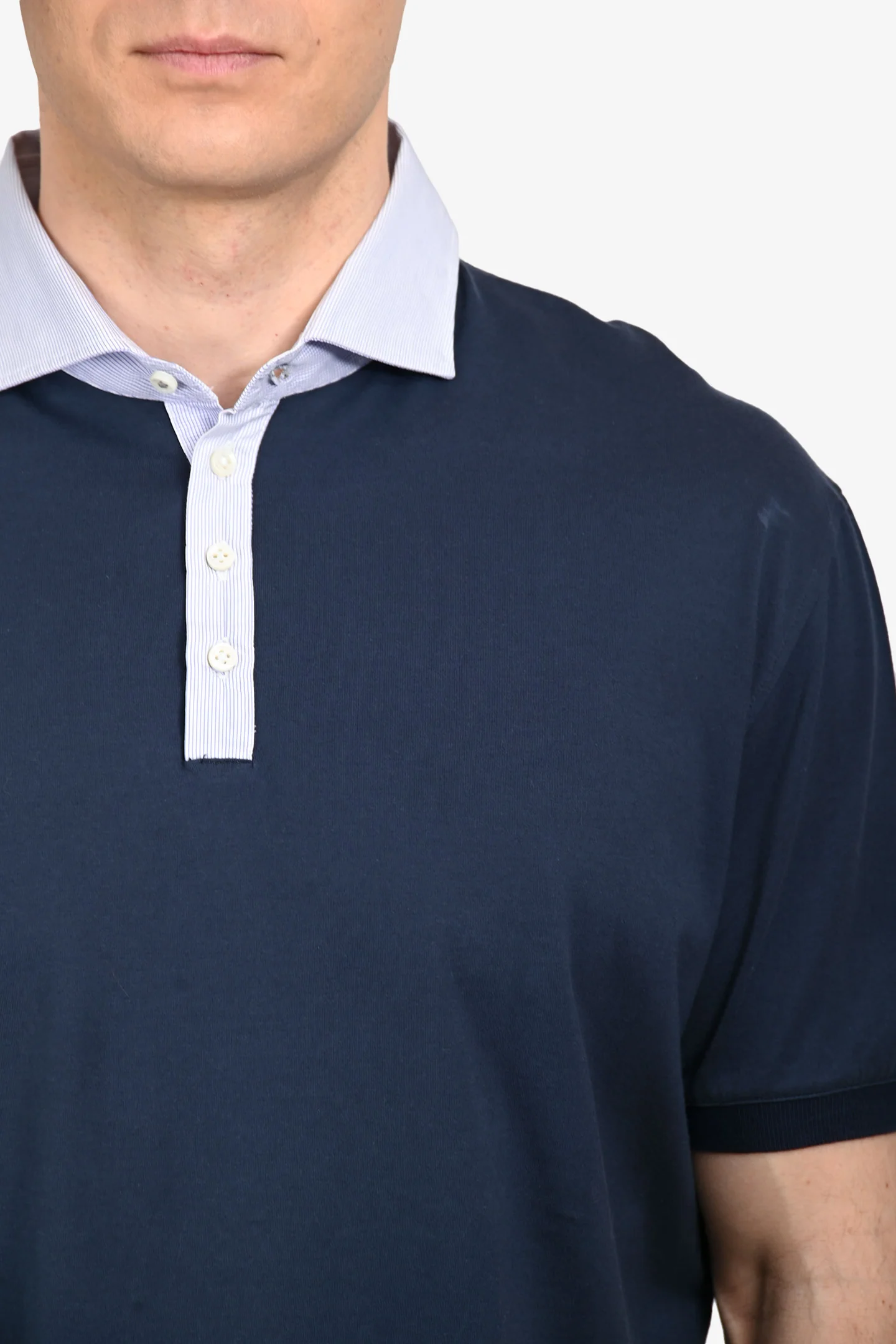 Brunello Cucinelli Blue Cotton/Poplin Polo Shirt. Collared neckline with button closures. Short, ribbed sleeves. Tonal stitching.