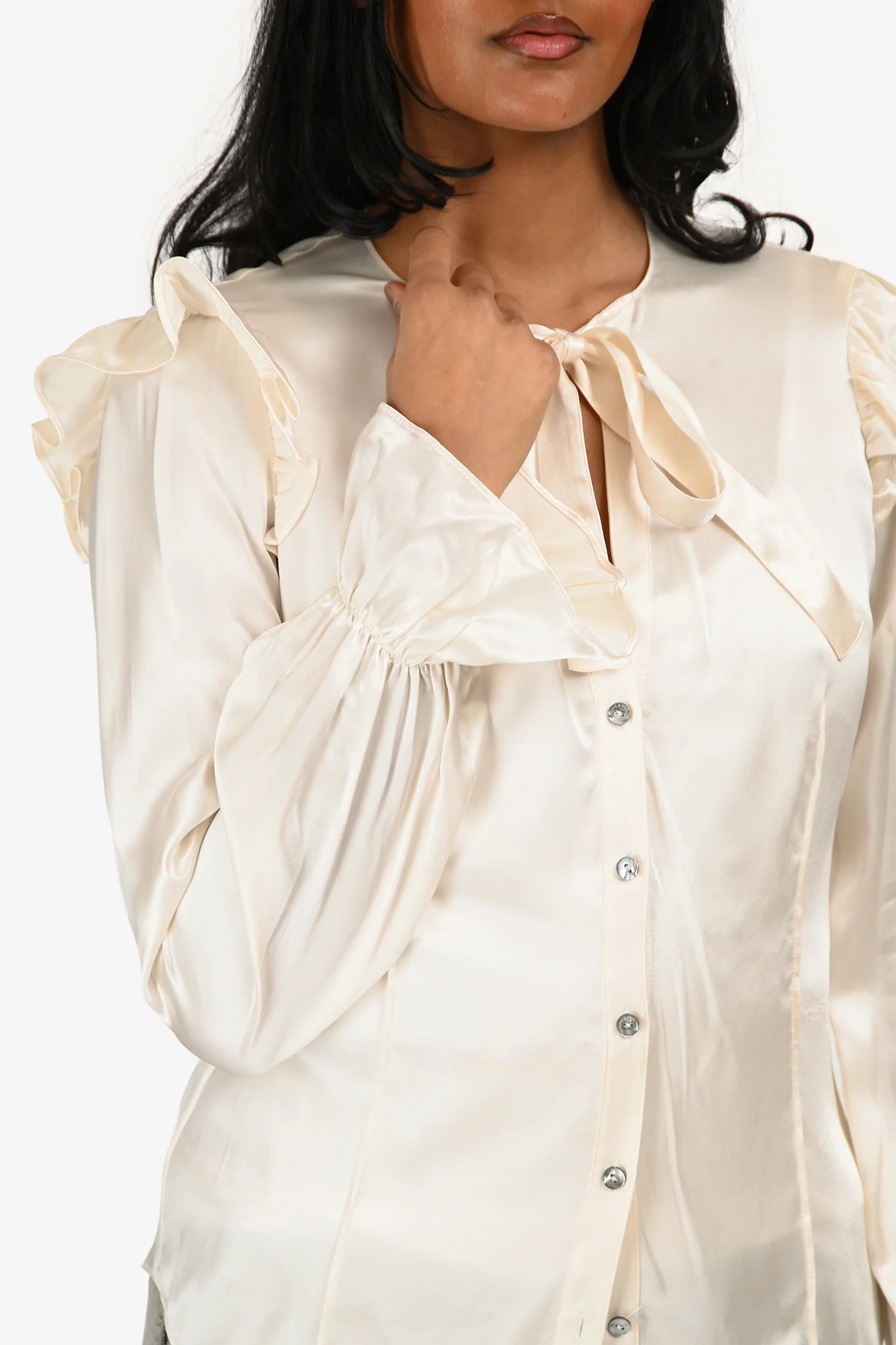 Cinq à Sept Cream Silk Button-Up Blouse. Pull-on. Round neckline with tie. Front button-up closure. Tonal stitching.