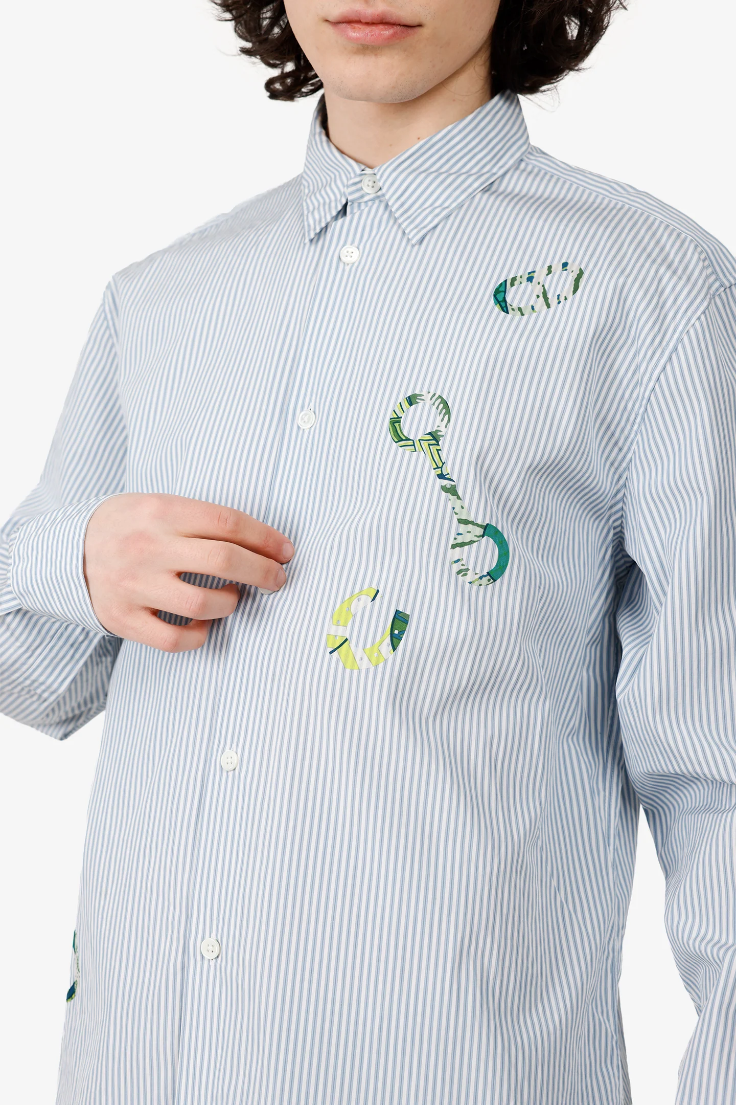 Hermes Blue/White Striped Horsebit Print Long Sleeve Shirt. Pull-on. Collared-neckline. Front button-up closure. Sleeve cuffs with button-up closure. Silver-tone hardware. Tonal stitching.