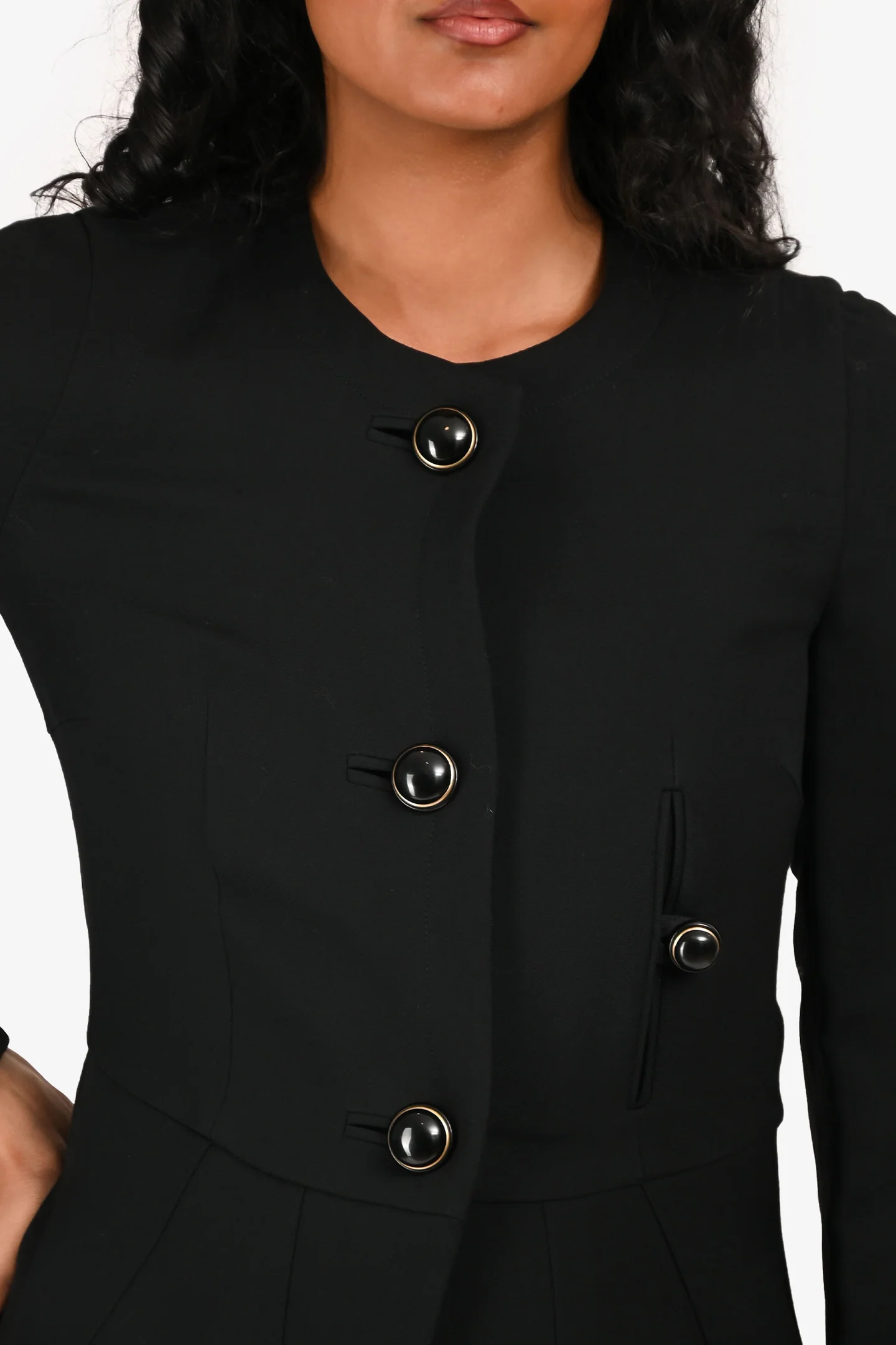 Marni Black Wool/Silk Coat. Front button closure. Band collar. One side pocket with button closure. Two side seam pockets. Black and gold-tone hardware. Tonal stitching.