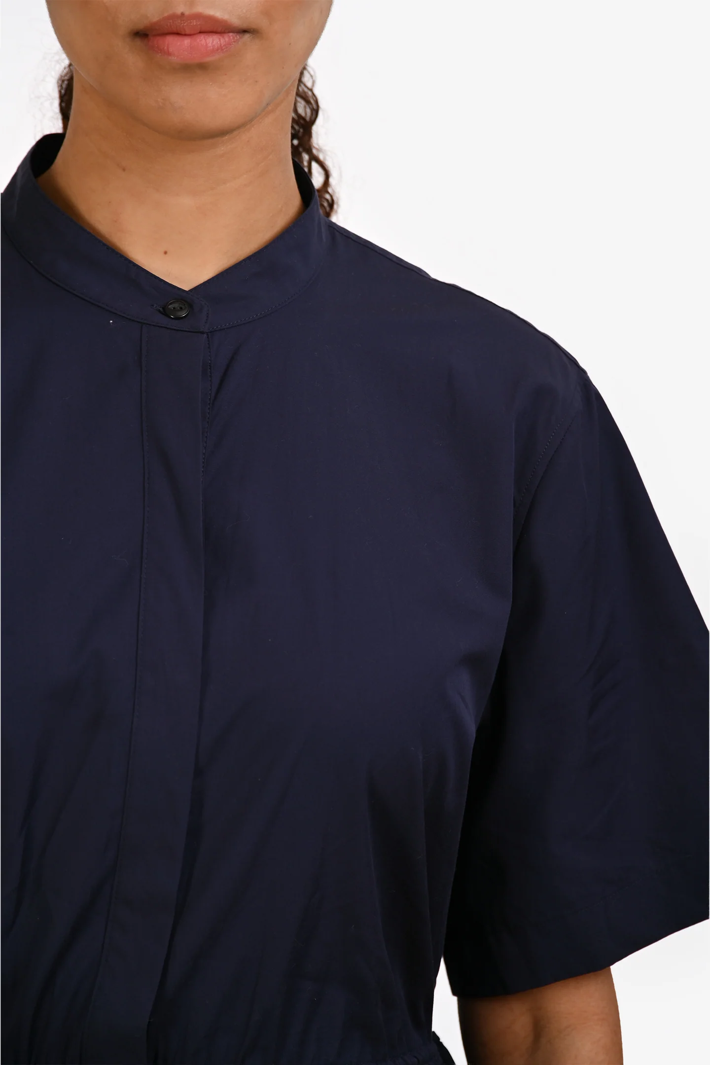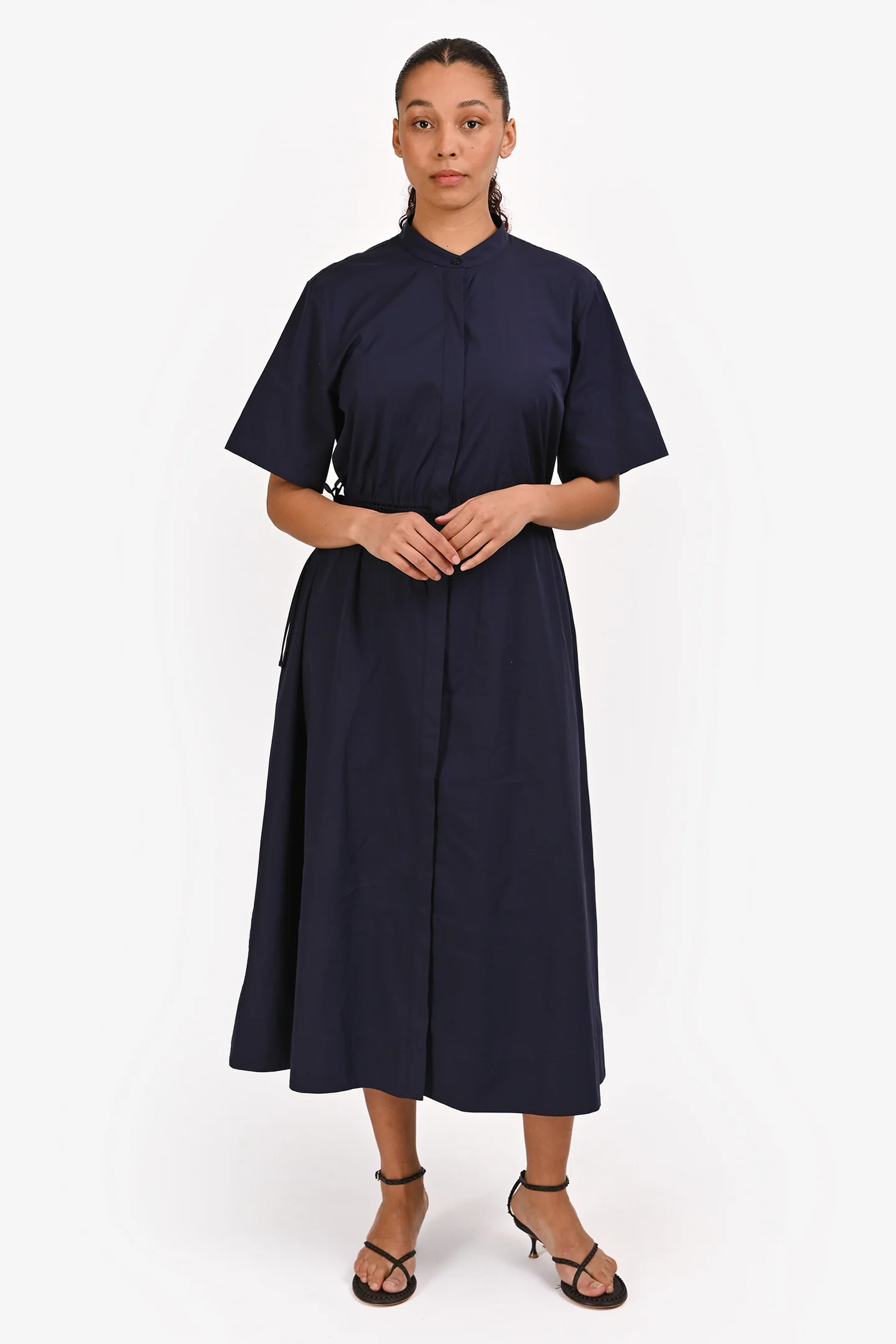 Rag & Bone Navy Ronan Midi Dress. Collarless neckline. Front button-up closure. Adjustable tie at the waist. 2 exterior slip pockets. Unlined interior. Tonal stitching.