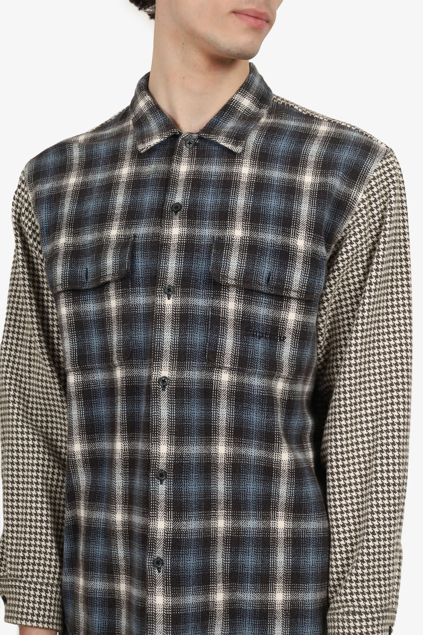Supreme Navy Houndstooth Plaid Flannel Shirt. Collared neckline. Front button-up closure. Sleeve cuffs with button-up closure. 2 exterior chest fold-over flap pockets. Tonal stitching.
