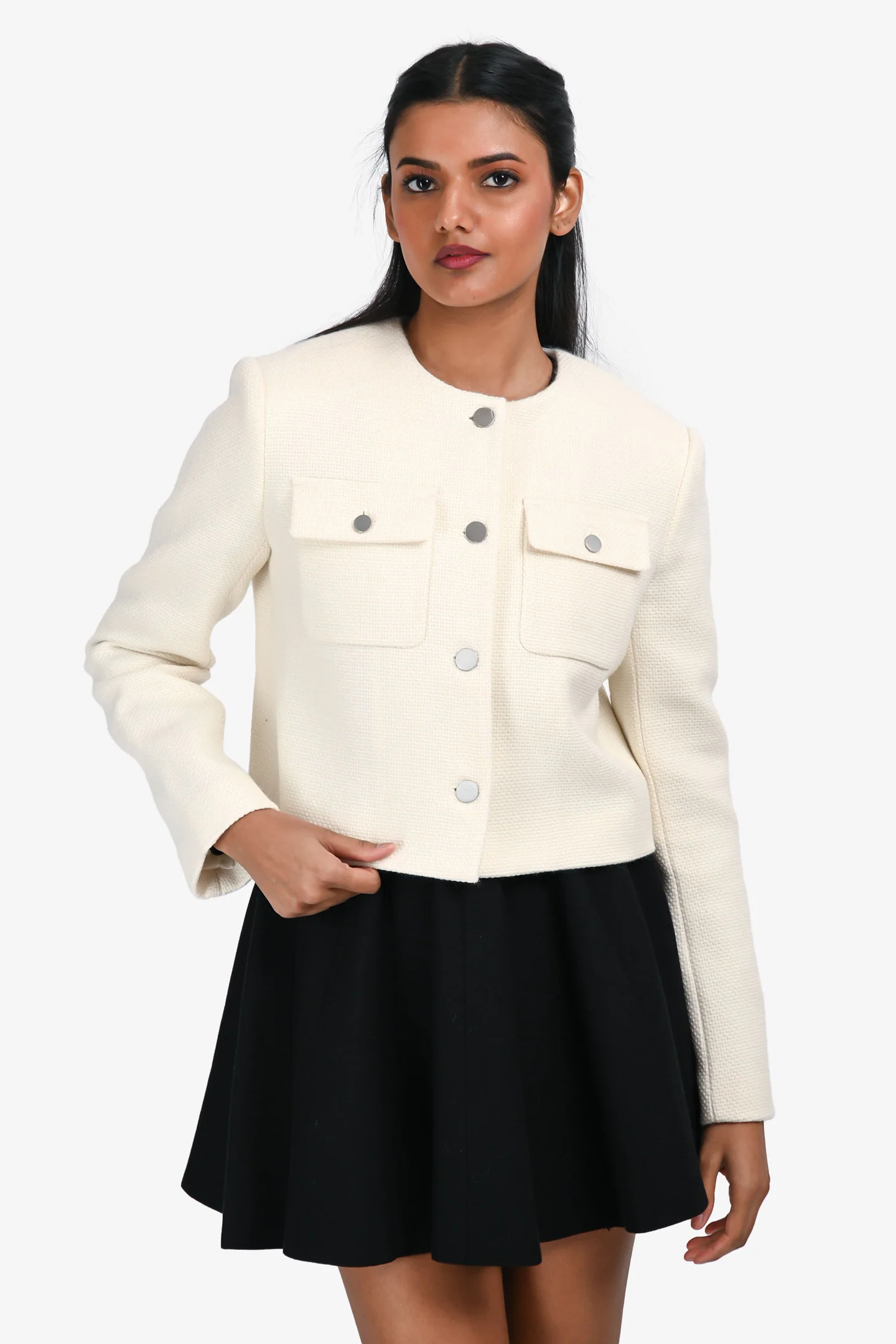 Theory Cream Cotton/Wool Tweed Cropped Jacket. Round neckline. Front button closure. Padded shoulders. 2 exterior slip pockets with button closures. Fully lined interior. Silver-tone hardware. Tonal stitching.